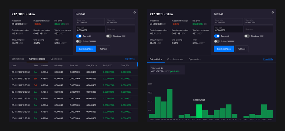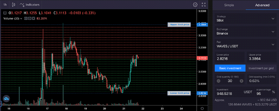 Using the Grid Strategy, the bot will analyze the price trends to buy at low and sell at high prices for high-profit margins, exploiting sideways, and rising markets. When markets are falling, a cost-average effect and a profit generated by the bot will offset the negative value change of a base currency.