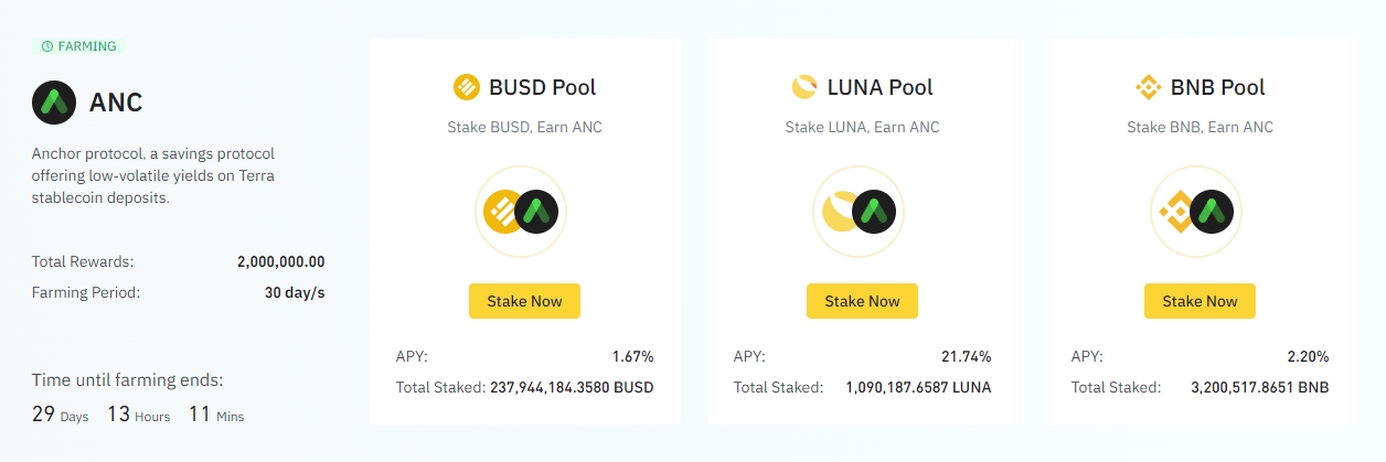 Participation in the Anchor Protocol farming program provides Binance users with an opportunity to earn ANC tokens by staking BNB, BUSD, or LUNA. The rewards are distributed to users on a daily basis and split among pool participants based on the amount of funds they’ve contributed to the particular pool.